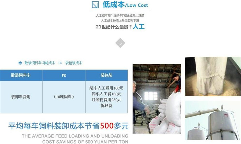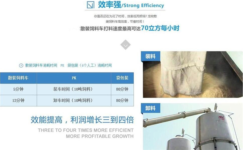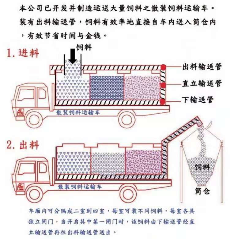 散裝飼料車的優(yōu)勢: 散裝飼料的生產(chǎn)可實現(xiàn)直接生產(chǎn)直接裝車,隨產(chǎn)隨出,不需要進(jìn)行提前備貨,不占用倉儲設(shè)施,也不會出現(xiàn)停產(chǎn)等待拉料的現(xiàn)象,使飼料生產(chǎn)實現(xiàn)計劃管理,生產(chǎn)效率得到提升。 ★獨有倒梯形設(shè)計,散裝飼料在罐體內(nèi)密封輸送,V字形罐體卸料順暢,減少飼料的耗損,保證質(zhì)量,避免污染。 ★運輸比包裝成袋運輸不但節(jié)省勞動力,而且成本較低。 ★可選電動卸料、全液壓卸料、氣卸為全自動上料卸料,可連續(xù)作業(yè),大大提高生產(chǎn)效率。 ★罐體內(nèi)可加裝分倉,可同時運輸多種不同類的飼料或膨人介質(zhì)。部件標(biāo)準(zhǔn)化,容易維修保養(yǎng)。 頂部進(jìn)料倉