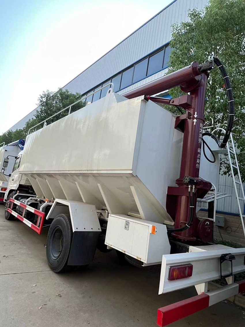 散裝飼料運(yùn)輸車,散裝飼料車的飼料罐架設(shè)在卡車的底盤上,罐頂開有進(jìn)料口.頂部的一根螺旋輸送卸料管(俗稱卸料絞龍)則可自由回轉(zhuǎn)和抬升,抬升的仰角可達(dá)60度。運(yùn)輸時(shí),頂部的螺旋管平臥在罐頂;卸料時(shí)則抬起,使管端的出料口與畜禽飼養(yǎng)場(chǎng)貯料罐頂部的進(jìn)料門相接,駕駛室內(nèi)裝有操縱裝置(操縱裝置也可裝置在罐體尾部),卸料時(shí)通過車底的動(dòng)力輸出軸和減速器來驅(qū)動(dòng)螺旋,以完成卸料。