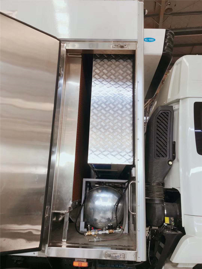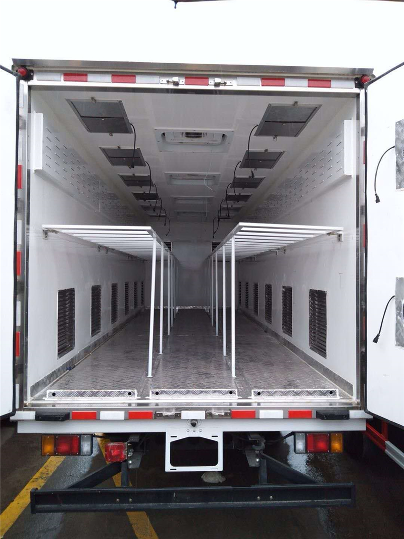 【豬苗車(chē)】上裝配置:外玻璃鋼,內(nèi)不銹鋼,兩層液壓升降層板,尾部液壓翻轉(zhuǎn)上豬平臺(tái),層板為不銹鋼骨架鋪鋁花紋板。外部電動(dòng)升降窗,排氣扇,柴油發(fā)電機(jī),暖風(fēng)加熱,喂水系統(tǒng),凈水箱、污水箱,箱內(nèi)攝像頭監(jiān)控,倒車(chē)影像,凱利制冷機(jī)組。(油暖加熱為選裝部件)
