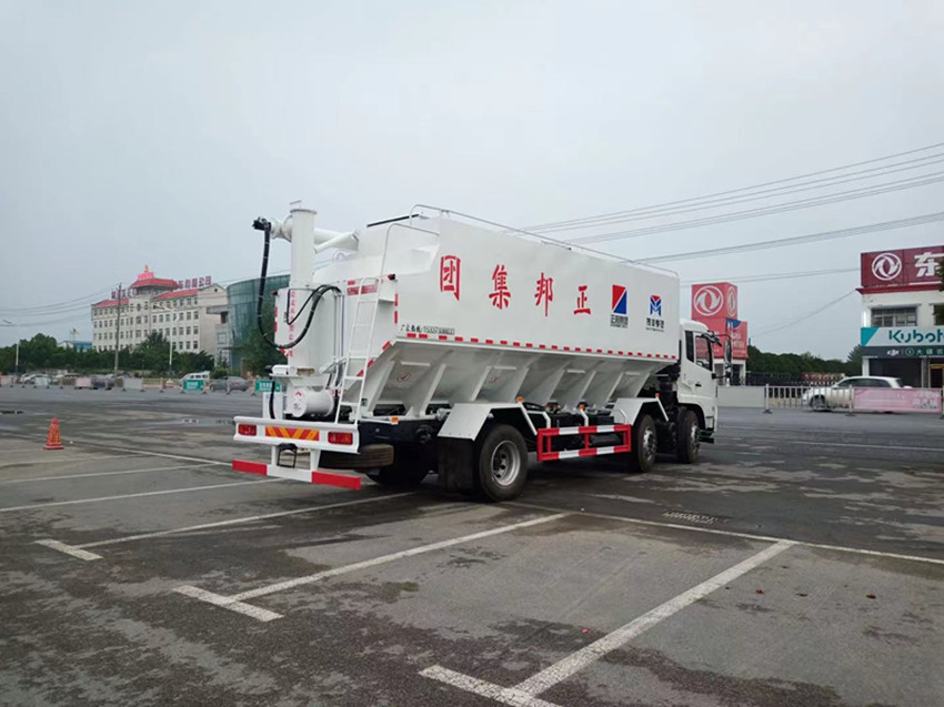 散裝飼料運(yùn)輸車(chē),散裝飼料車(chē)的飼料罐架設(shè)在卡車(chē)的底盤(pán)上,罐頂開(kāi)有進(jìn)料口.頂部的一根螺旋輸送卸料管(俗稱(chēng)卸料絞龍)則可自由回轉(zhuǎn)和抬升,抬升的仰角可達(dá)60度。運(yùn)輸時(shí),頂部的螺旋管平臥在罐頂;卸料時(shí)則抬起,使管端的出料口與畜禽飼養(yǎng)場(chǎng)貯料罐頂部的進(jìn)料門(mén)相接,駕駛室內(nèi)裝有操縱裝置(操縱裝置也可裝置在罐體尾部),卸料時(shí)通過(guò)車(chē)底的動(dòng)力輸出軸和減速器來(lái)驅(qū)動(dòng)螺旋,以完成卸料。