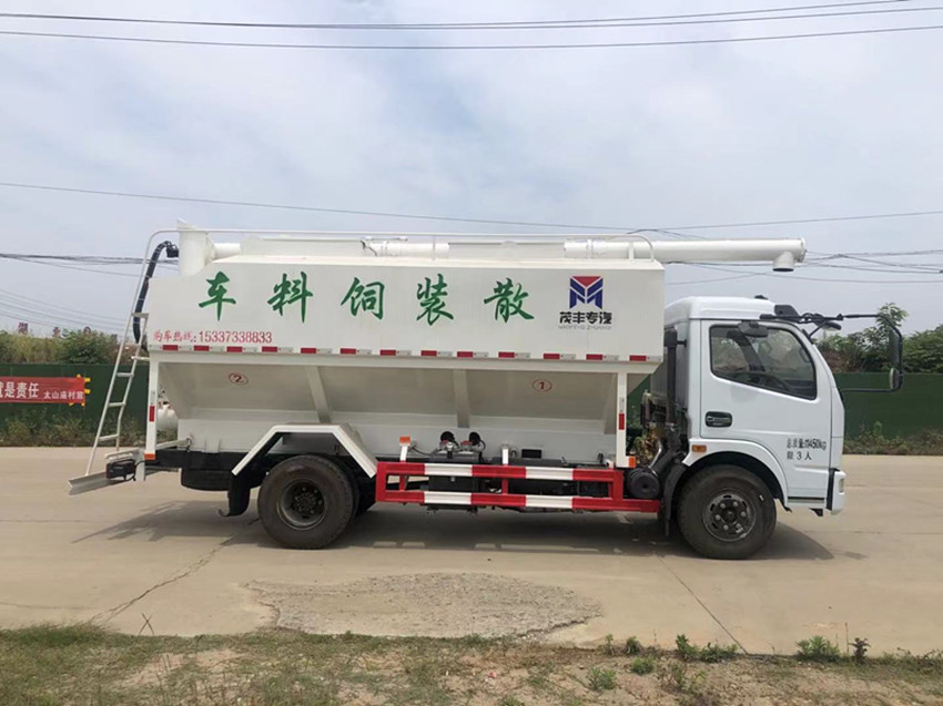 散裝飼料運(yùn)輸車,散裝飼料車的飼料罐架設(shè)在卡車的底盤上,罐頂開有進(jìn)料口.頂部的一根螺旋輸送卸料管(俗稱卸料絞龍)則可自由回轉(zhuǎn)和抬升,抬升的仰角可達(dá)60度。運(yùn)輸時(shí),頂部的螺旋管平臥在罐頂;卸料時(shí)則抬起,使管端的出料口與畜禽飼養(yǎng)場貯料罐頂部的進(jìn)料門相接,駕駛室內(nèi)裝有操縱裝置(操縱裝置也可裝置在罐體尾部),卸料時(shí)通過車底的動力輸出軸和減速器來驅(qū)動螺旋,以完成卸料。